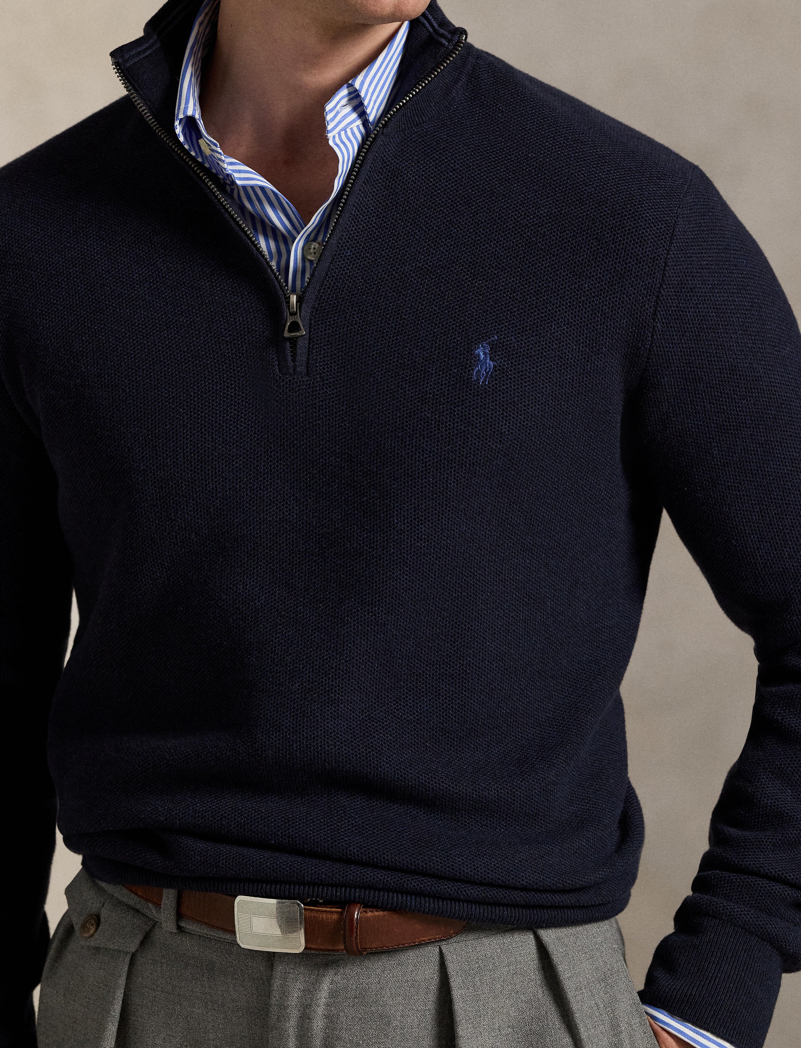 - Rib-knit mockneck. Quarter-zip placket. Zipper pull custom-developed with a “Polo” logo.