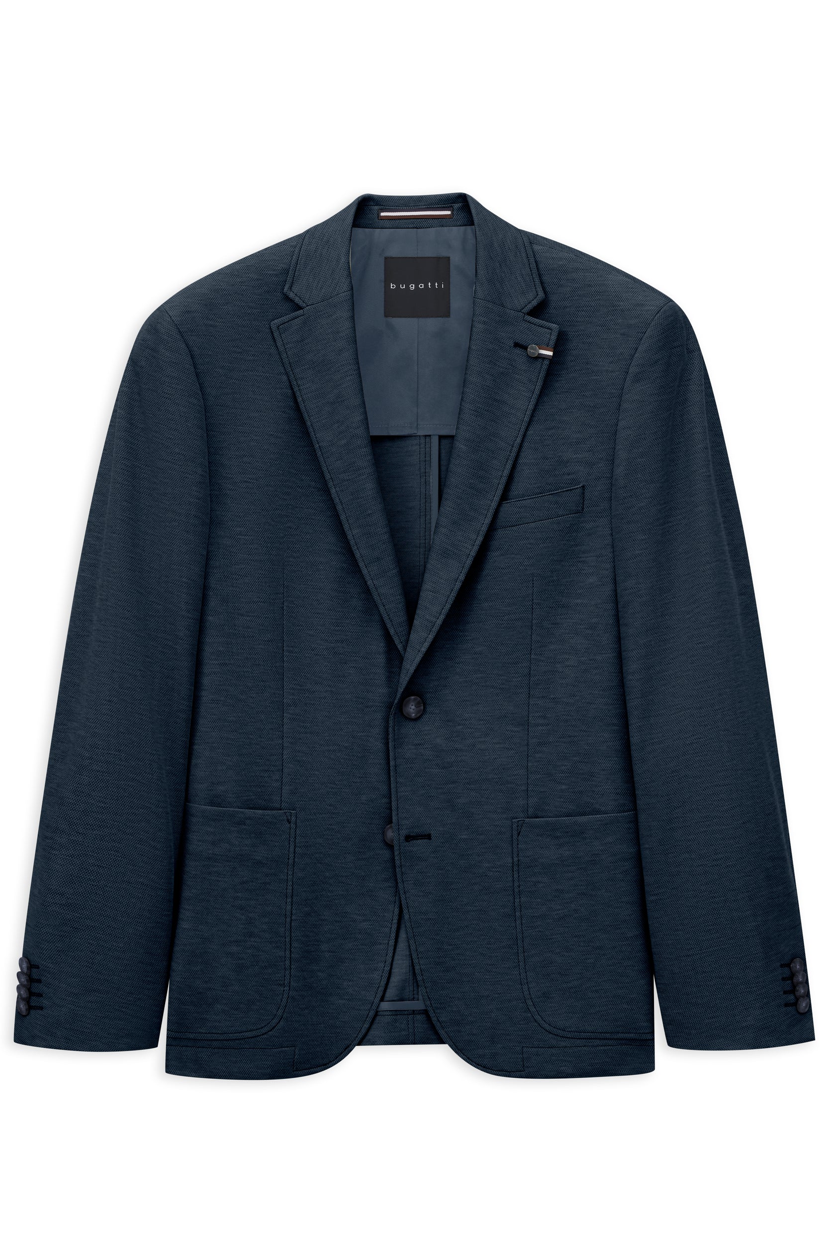 This Bugatti blazer in a regular fit features a classic notched lapel, patch pockets, and a chest pocket. A clutch pin with a strap on the lapel adds a stylish detail. Made from a stretch jersey fabric, it offers exceptional comfort. Color-coordinated accents in the lining and inner pockets complete the design, while side vents ensure optimal freedom of movement.