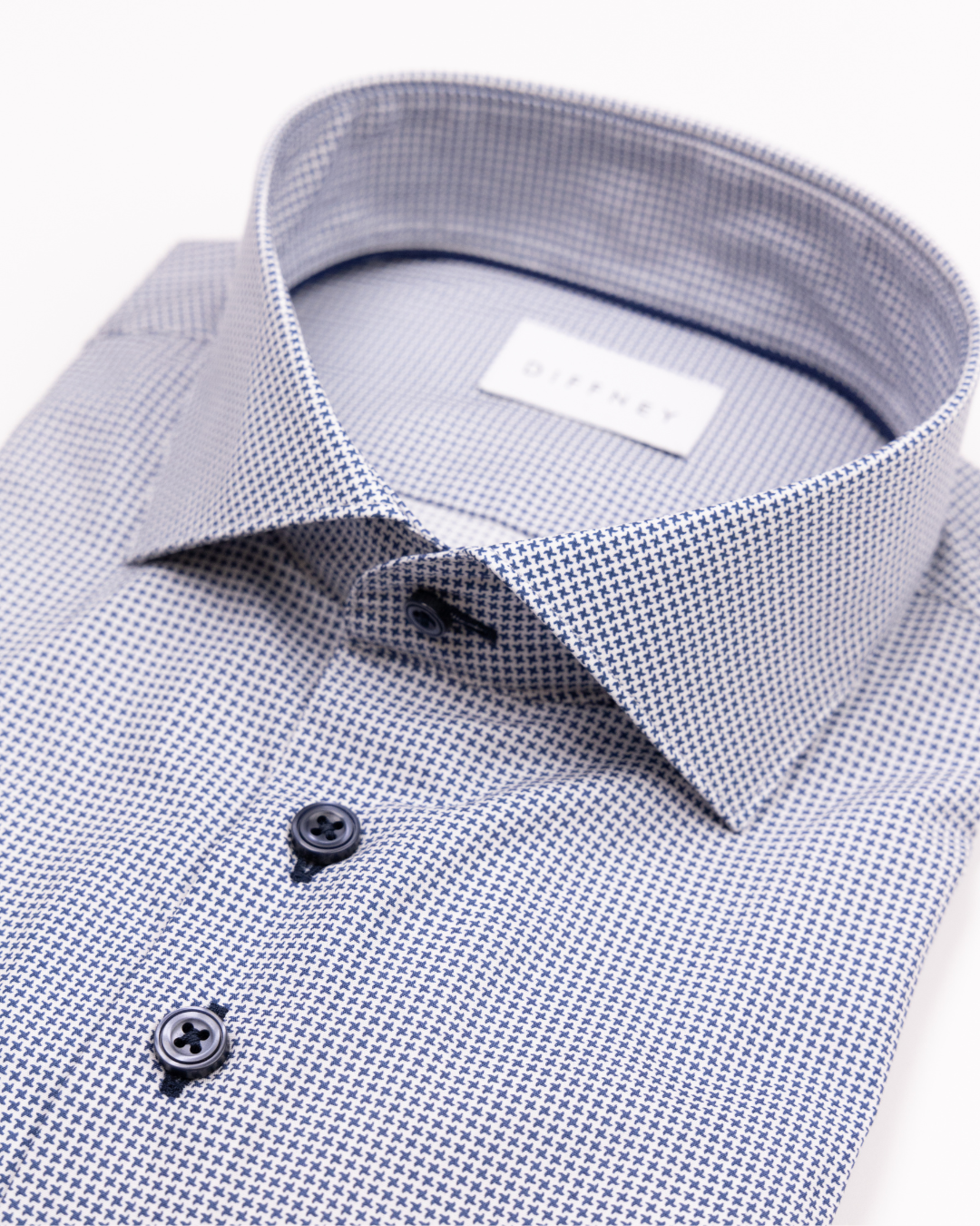 This light blue shirt crafted from 100% cotton, features a subtle micro check pattern that adds texture and sophistication without overpowering your look, the modern cut ensures a sharp silhouette, while the contrasting buttons provide a refined finishing touch.