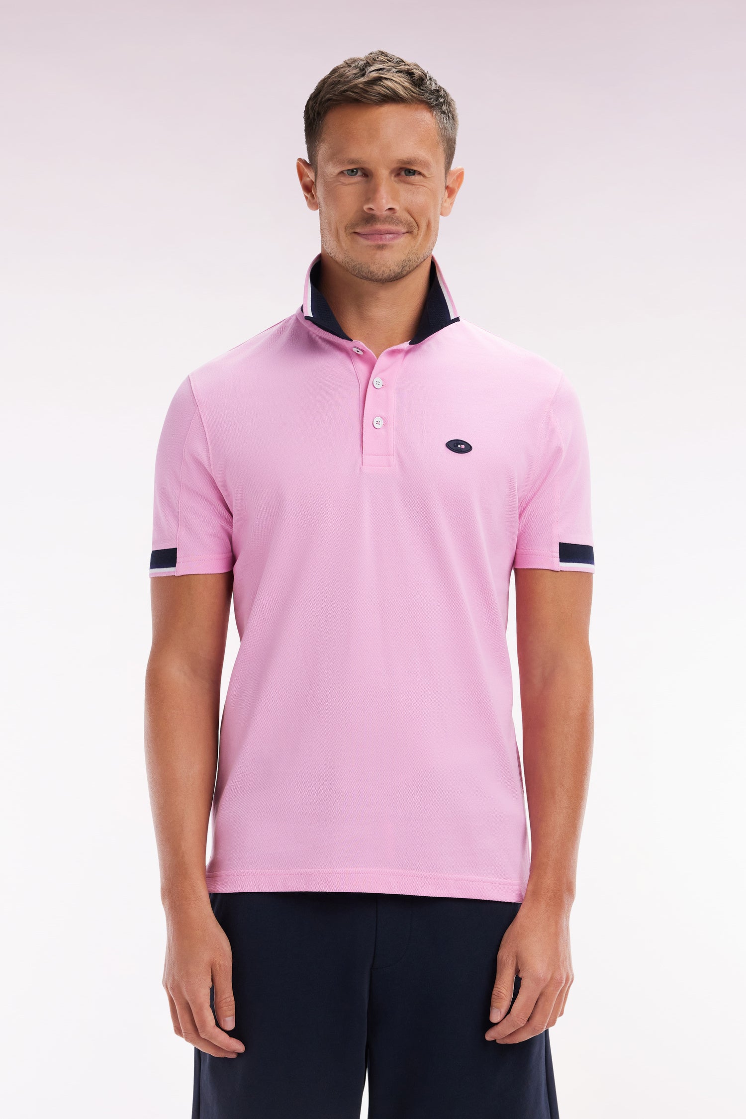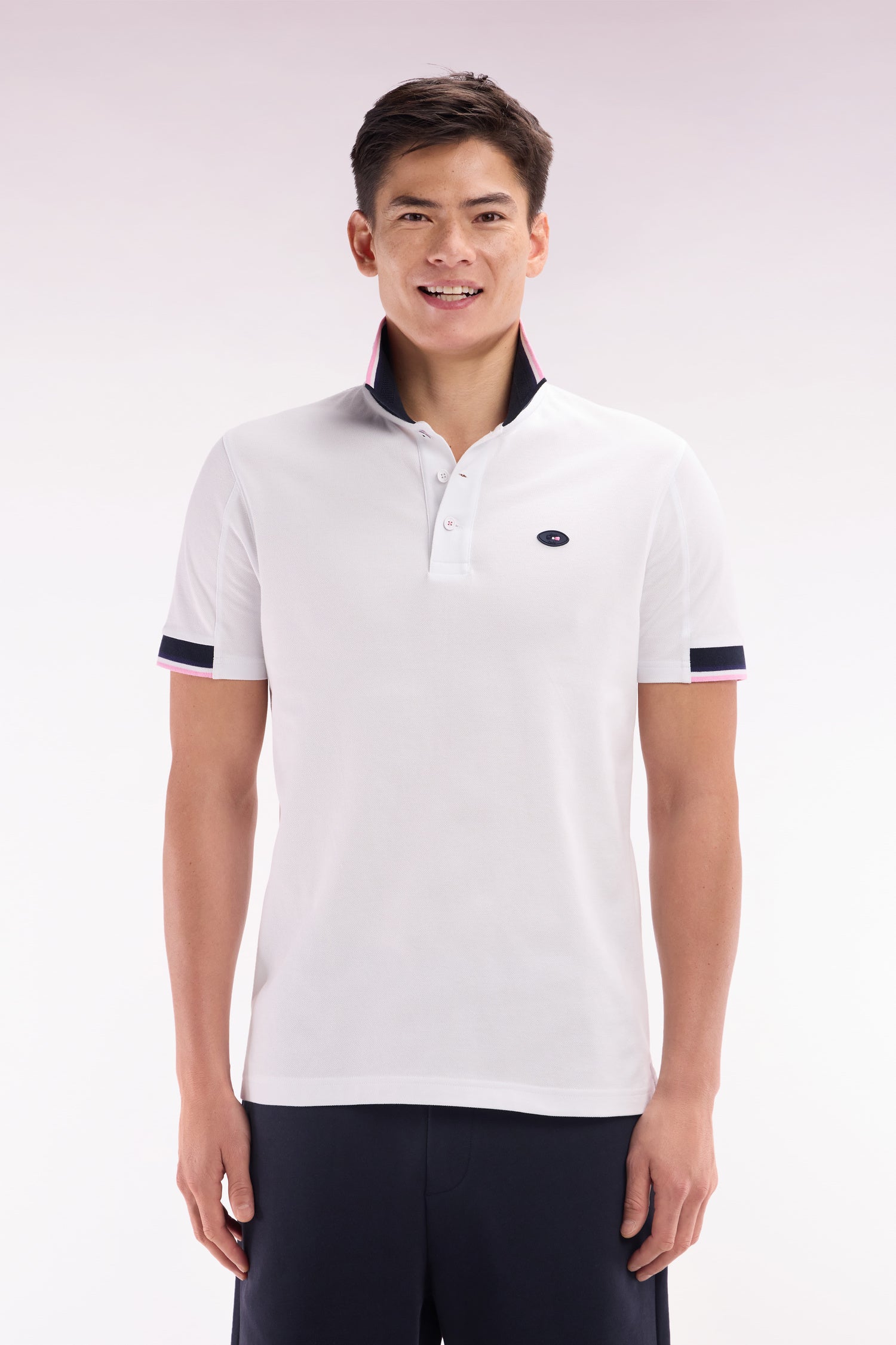 Embrace subtle elegance with this straight polo shirt, crafted with meticulous attention to detail by our Maison's atelier. The navy polo collar complements the tone-on-tone and navy sleeve edges for a harmonious look. Graphic piping on the sleeves adds a modern touch. Available in navy, pink, or white.