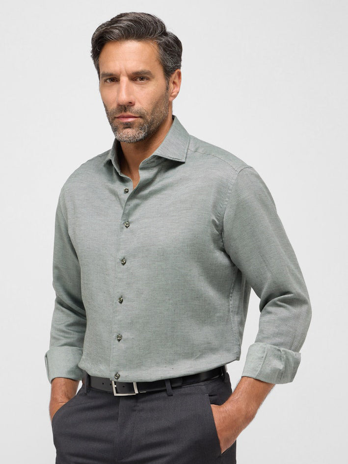 The Eterna Long Sleeve Shirt is a versatile option for everyday wear, as well as casual occasions. The shark collar and solid color design make it easy to pair with various outfits. The easy-care fabric, made of a blend of cotton and linen, ensures optimal comfort. With its modern fit and shortened hem, this shirt offers a stylish twist on a classic style.
