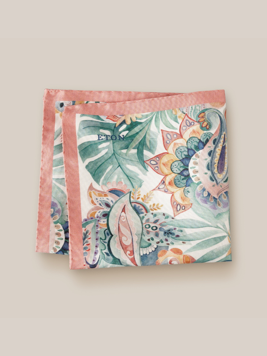 Enhance your spring tailoring with the Eton Floral Silk Pocket Square. Made from 100% silk, this pocket square features a vibrant hand-painted floral print inspired by Antoni Gaudí’s Park Güell. Its Oxford weave provides elegant structure when folded. Add a playful pop of color to your look.