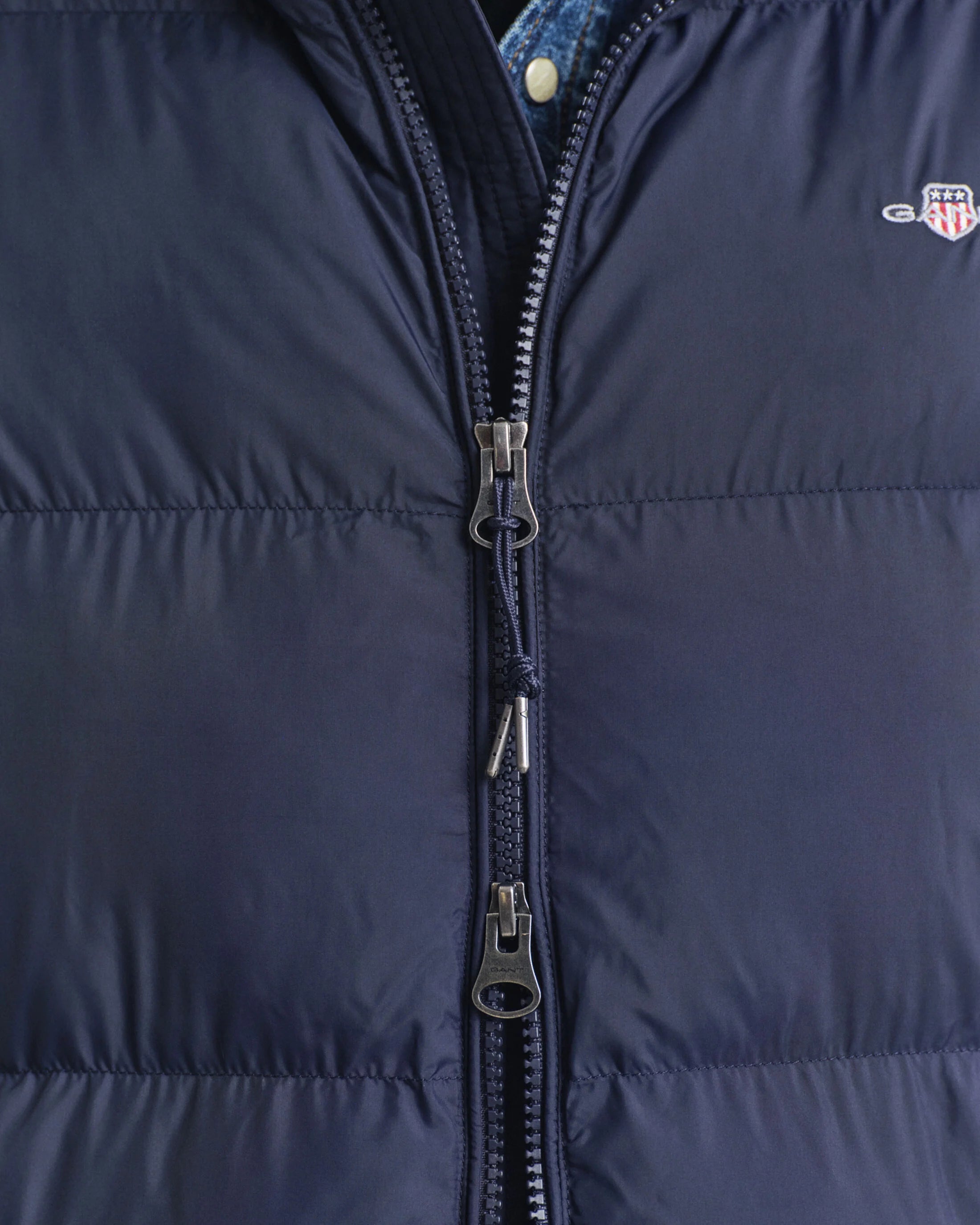 Made from recycled polyester with a water-repellent finish, it features a puffer silhouette with a detachable hood, adjustable drawstrings, and a secure front zip closure. Cut in a regular fit with a length that falls below the hips, it provides lightweight warmth thanks to its fully lined, padded interior. Functional details include side zip pockets, elasticated cuffs for a snug fit, and a GANT shield graphic at the chest. Finished with a Durable Water Repellent (DWR) treatment, this jacket sheds light rain and can be reactivated after washing to maintain long-lasting performance.