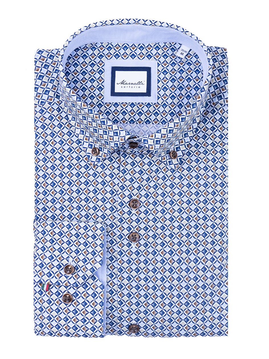 Experience the highest quality with Marnelli Scott's Retro Print Shirt. Made with 100% cotton, this contemporary fit shirt strikes the perfect balance between regular and slim, giving you a smart look under a suit or casually with chinos. Elevate your style with Marnelli.