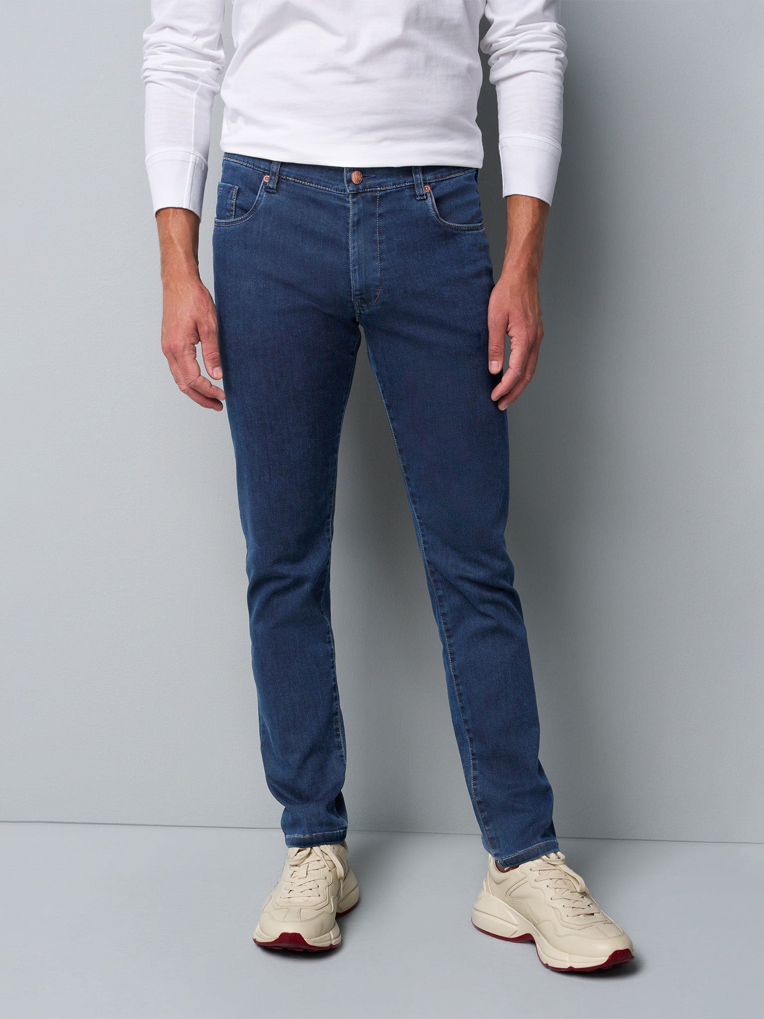 Introducing Meyer M5 Slim Jeans. Made with soft organic cotton and playful multicolour stitching, these slim fit denims effortlessly enhance your business or leisure look. With individually hand-applied special effects and a super-stretch fabric, enjoy maximum freedom of movement and comfort. Features also include a contoured waistband, coin pocket, and colourful lining. Experience the ultimate quality with genuine M5 trousers.