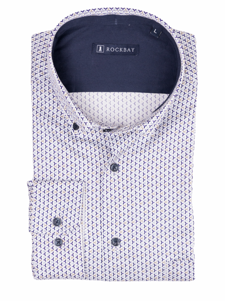 Made with satin stretch and breathable cotton, our Rockbay beige and navy print shirt is perfect for summer. Its smart casual style will keep you looking sharp all season long. Enjoy the comfort of long sleeves and a navy button down design.