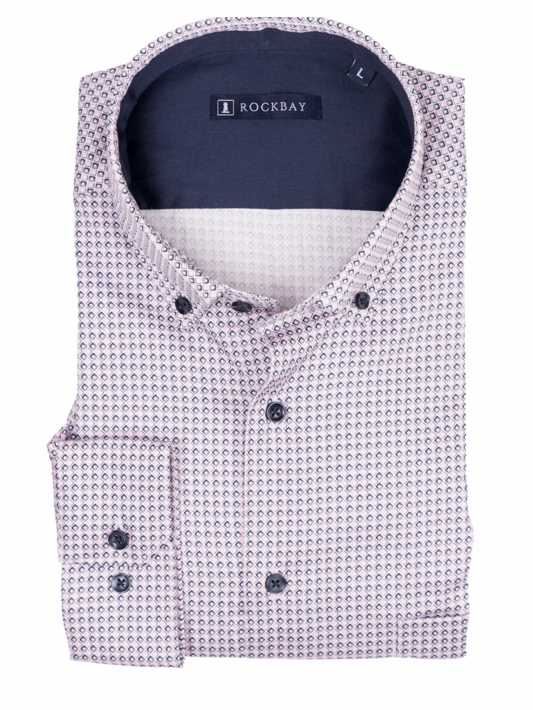Discover the perfect combination of comfort and style with our Rockbay Pink Diamond Pattern Button Down Shirt. Made from breathable cotton and featuring a satin stretch finish, this long sleeve shirt is ideal for staying cool in the summer months. The navy button down adds a touch of smart casual to any outfit.