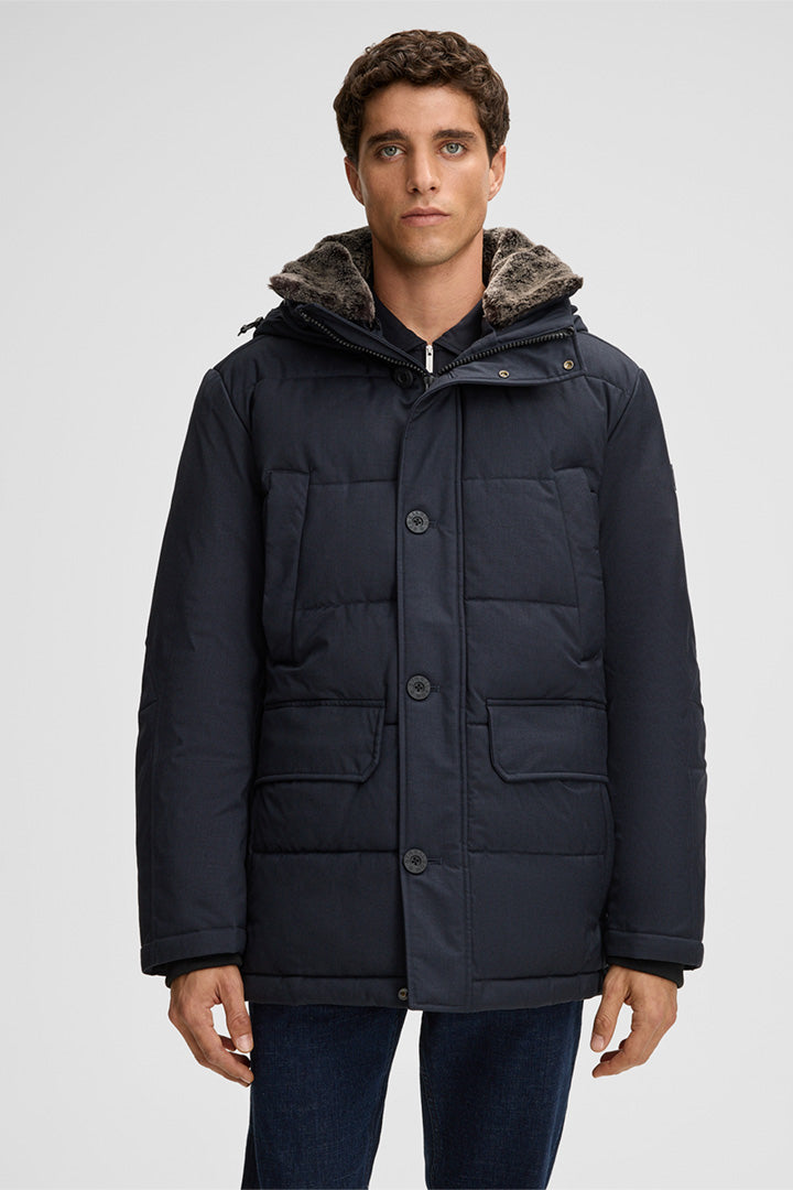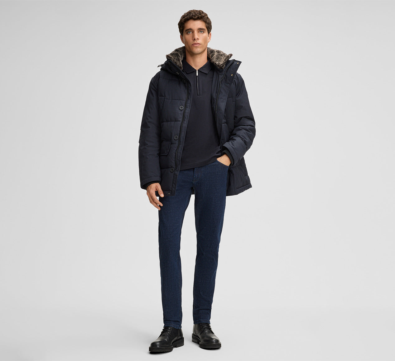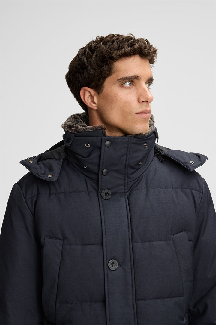 - Quilted jacket with stand-up collar and zip-off faux fur trim